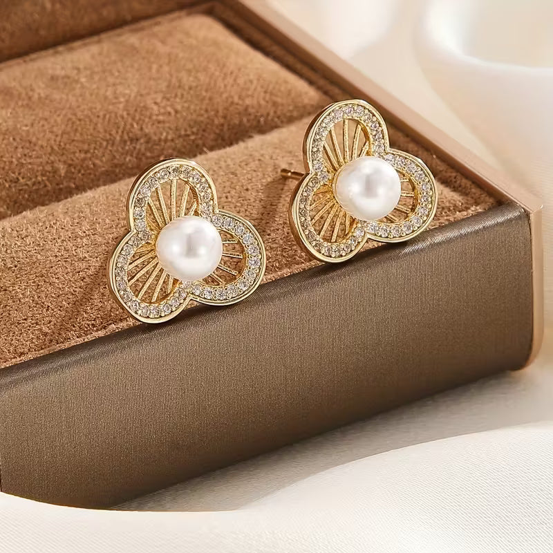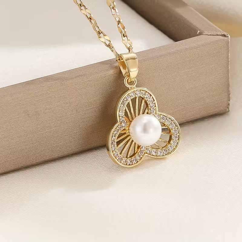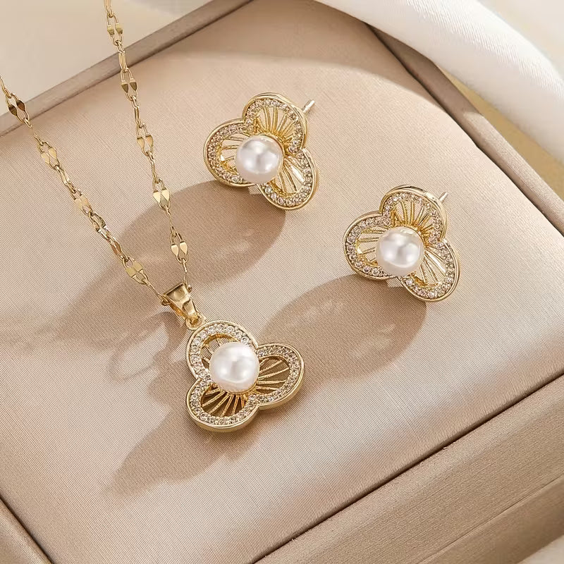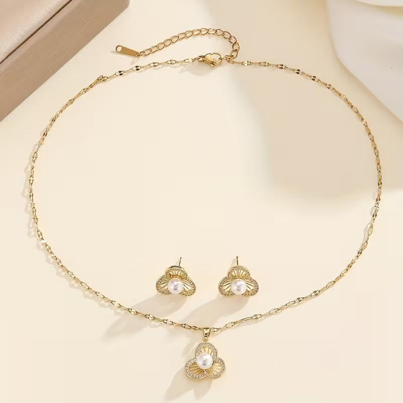 Każdy element biżuterii został precyzyjnie wykonany w kształcie delikatnej, trójlistnej koniczyny. W centrum każdej koniczyny dumnie osadzona jest lśniąca, biała perła, która dodaje klasycznego uroku i wyrafinowania. Listki koniczyny są misternie wysadzane drobnymi, błyszczącymi cyrkoniami, które wspaniale odbijają światło, tworząc efekt subtelnego blasku. Komplet wykonany jest z wysokiej jakości pozłacanego metalu, co gwarantuje trwałość i odporność na zmatowienie.